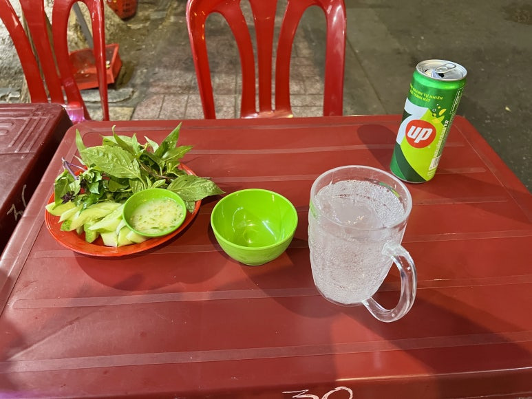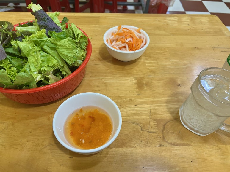 화려한 쌈? 채소 세트와 무+당근, 베트남칠리소스?가 나온다.